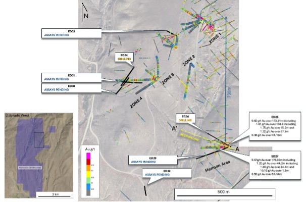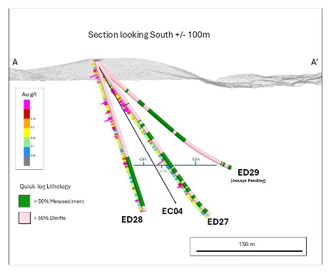 Drill holes ED27 and ED28, the first holes completed in the newly permitted Herman Area, are located 730 meters south of recently reported hole E26 (Figure 1-2). Both ED27 and ED28 intersected broad, pervasive intervals of strong gold mineralization from surface, and identified a new mineralized contact zone between the host sedimentary rocks and the diorite. The newly recognized diorite–metasedimentary contact zone is shallow-dipping, laterally extensive, and projects south, west, and northwest of ED27 and ED28 (Figure1-2). This geometry creates a new broad exploration target that has the potential to host both bulk-tonnage and high-grade gold mineralization across a large area of the previously unexplored, southern and western portions of the property. In addition, this structural setting has been identified with strong mineralization at the newly acquired Eldorado East project and supports the geological model that the mineralization at Eldorado spans both Eldorado East and West.