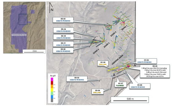 Hole ED29 was drilled southwestward from the Herman area into a previously undrilled region, approximately 50m to the south of ED27 (see press release dated October 8, 2025). ED29, hosted in both diorite and mixed metasediments, exhibited strong gold mineralization throughout its entire length and ended in strong mineralization at a depth of 254.51m (Table 1). ED29 continues to expand a new feeder zone found 800 meters to the south of Zone 1 (Figure 1-2), additionally discovering a new high-grade zone at its southernmost extent which is believed to be part of a new feeder system.